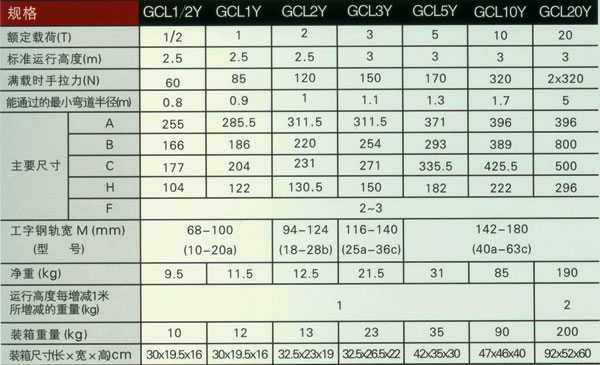 無錫太湖GCLY型系列手拉單軌小車技術(shù)參數(shù):