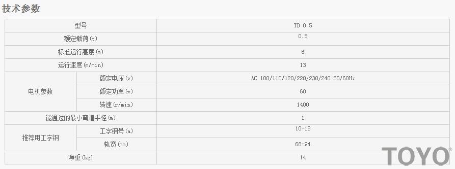 日本東洋TOYO TD電動(dòng)小車技術(shù)參數(shù):
