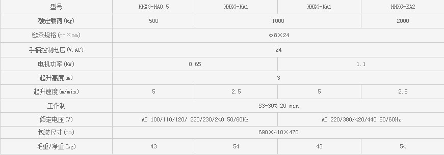 浙江凱勛HHDD-HA0.5-HA1 HHDD-KA1-KA2環(huán)鏈電動(dòng)葫蘆技術(shù)參數(shù):