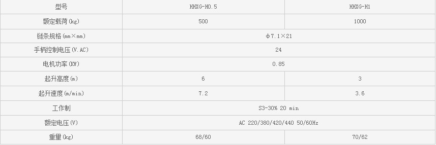 浙江凱勛HHXG-H0.5--HHXG-H1環(huán)鏈電動葫蘆技術(shù)參數(shù):
