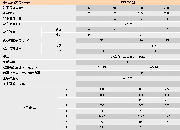 浙江手牌HEM-TL型手推手拉小車式電動葫蘆技術參數: