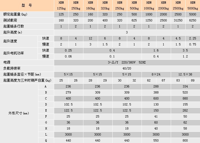 浙江手牌HEM型環(huán)鏈電動葫蘆技術(shù)參數(shù):