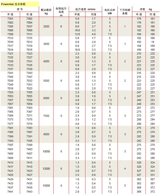 美國科美Powerstar型電動環(huán)鏈葫蘆技術(shù)參數(shù):