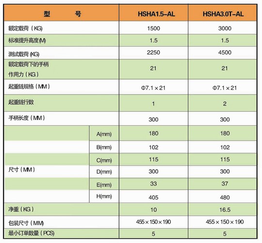 上海滬力鋁合金手扳葫蘆系列技術(shù)參數(shù):