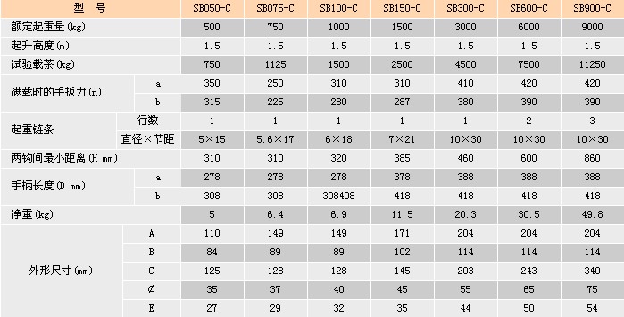 浙江手牌SB-C型手扳葫蘆參數(shù):