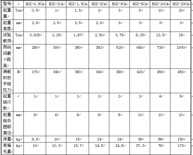 重慶凱榮1噸HSZ-CA型系列手拉葫蘆技術(shù)參數(shù):