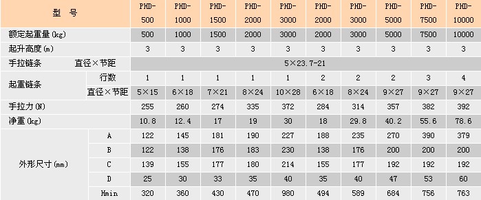 浙江手牌PHD型手拉葫蘆技術(shù)參數(shù):