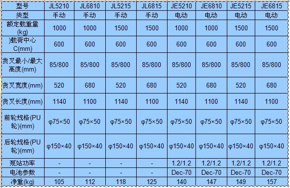 無錫虎力JL型剪式升高液壓搬運車(雙節(jié)油缸)技術(shù)參數(shù):