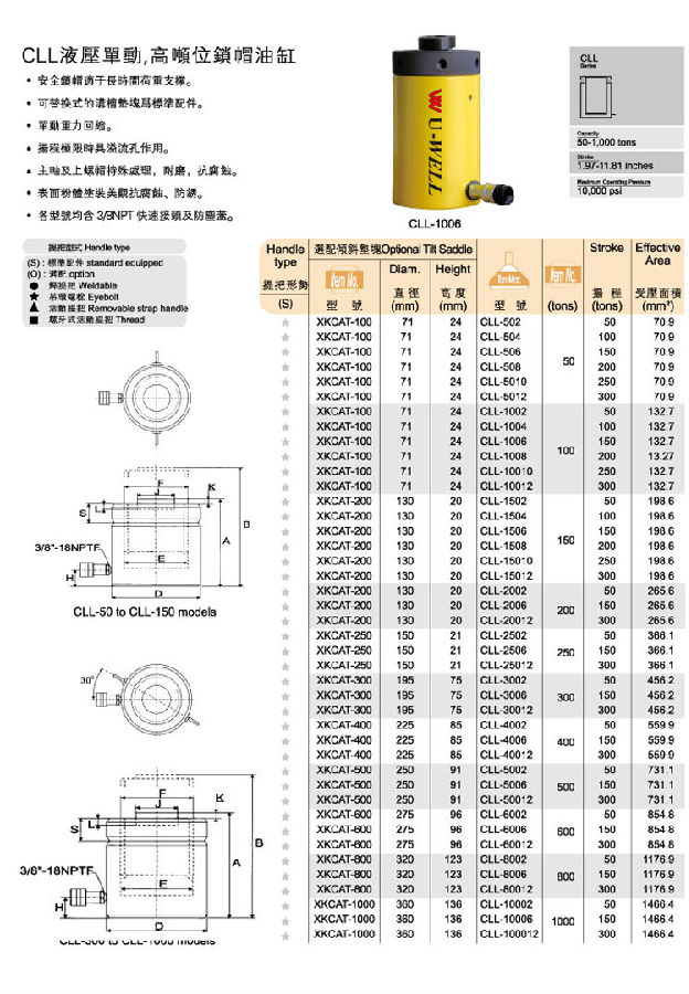 我公司所代理銷售的臺灣U-WELL優(yōu)偉CLL液壓單動高噸位鎖帽油缸憑借其優(yōu)異的質(zhì)量和完善的售后服務,受到了國內(nèi)外用戶的高度贊譽,在業(yè)界內(nèi)享有十分優(yōu)秀的聲譽。