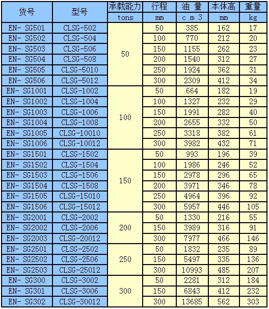恩派克CLSG系列單作用大噸位液壓油缸相關(guān)參數(shù):