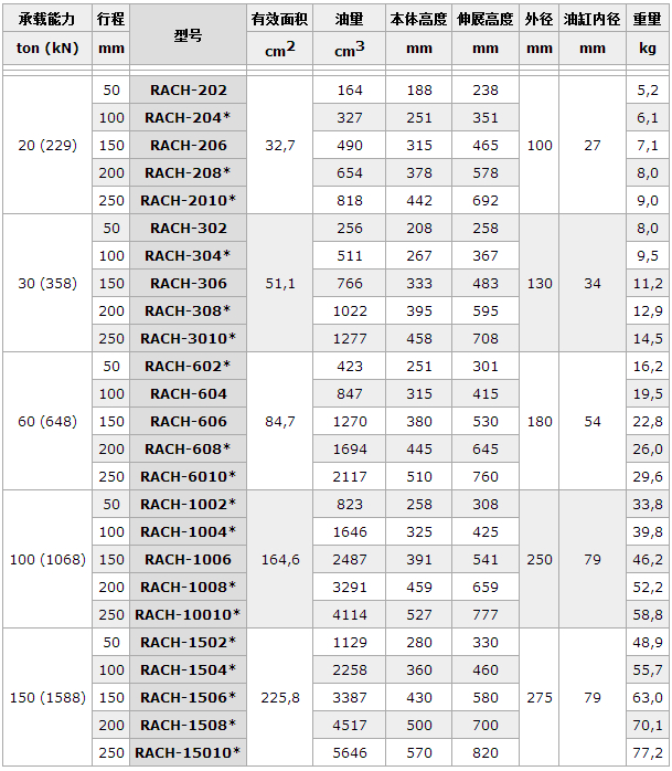 恩派克RACH系列鋁制中空柱塞油缸相關(guān)參數(shù):