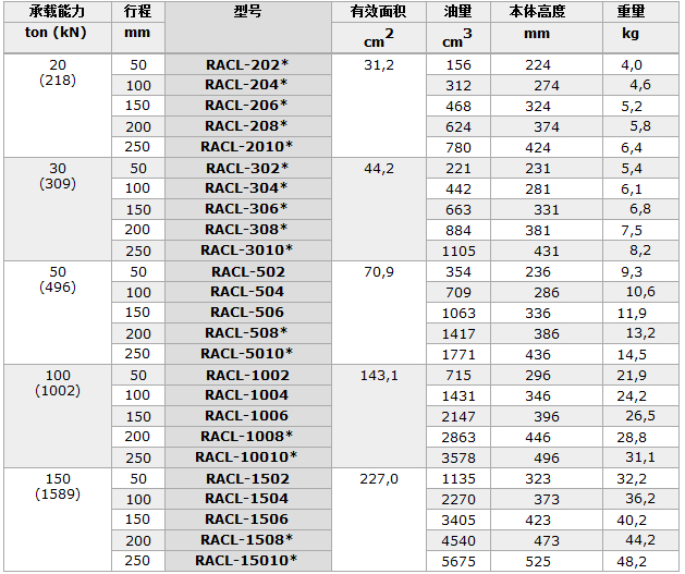 恩派克RACL系列鋁制螺母鎖定油缸參數(shù):