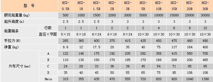 浙江手牌HSZ-B型手拉葫蘆技術(shù)參數(shù):